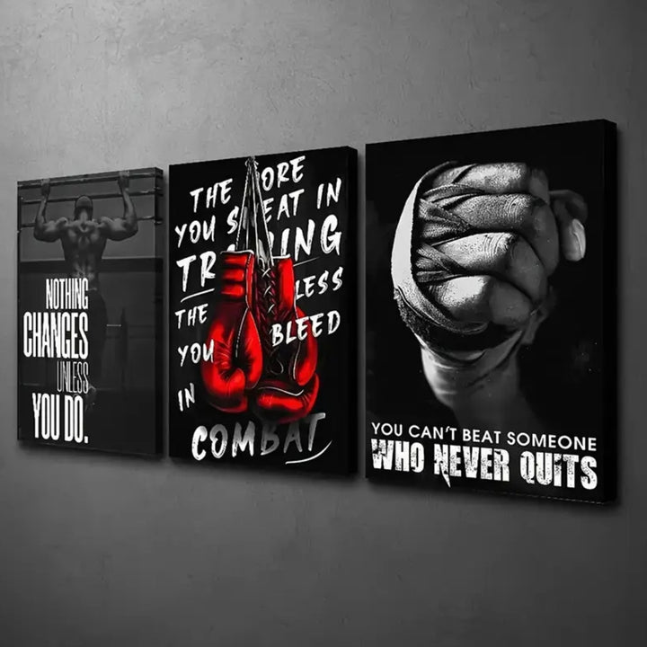 3-Piece Sports Wall Décor – Boxing Motivational Quote Prints, Athletic Black & White Art