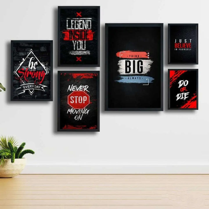 Elevate your living or workspace with this premium 6-piece motivational wooden wall art frame set. Featuring powerful and inspiring quotes like Be Strong, Think Big, Never Stop, Do or Die, and more, these frames are designed to keep you motivated every day. Crafted with high-quality wooden material, each frame offers durability and a sleek modern look that enhances any wall décor. Perfect for homes, offices, gyms, or study areas, this wall art set serves as a daily reminder to stay focused and driven.